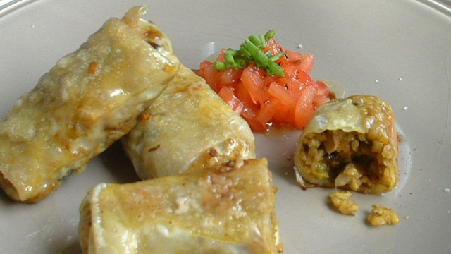 Confectionner les rouleaux en mettant un peu de cette farce à l'intérieur. Faire dorer dans une poêle avec un peu d'huile d'olive. Servir avec des dès de tomates fraîches arrosés d'huile d'olive et de vinaigre balsamique.