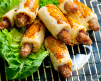 Enduisez chaque petit rouleau avec du jaune d'oeuf. Posez tous les rouleaux sur une plaque du four et faites cuire pendant une dizaine de minutes. Servez chaud avec un ramequin de ketchup, un de moutarde et quelques feuilles de salade verte.