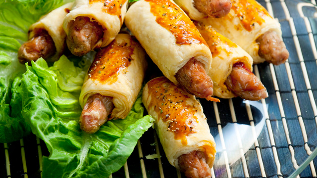 Posez une mini chipolata sur chaque petite bande de pâte. Roulez et sclellez la pâte avec un peu d'oeuf battu.