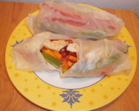 Placez-la sur une assiette puis déposez au centre, à la verticale, un peu de légumes, du surimi, de la menthe et un peu d'oignon.