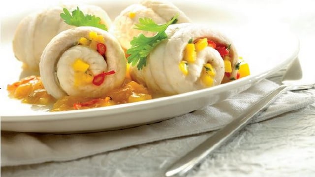 Mettez tous les ingrédients pour les rouleaux de poisson dans un bol et laissez reposer. Étendez les filets de sole à plat, côté peau vers le haut, et disposez la marinade de mangue sur les filets avant de les enrouler. Si nécessaire, utilisez un bâtonnet pour que le rouleau ne se défasse pas. Mettez les filets dans un plat perforé graissé de 1,5 litre, avec un plat non perforé de 1,5 litre en-dessous.
