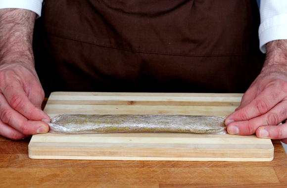 11Retirez le film étirable et coupez chaque boudin en tronçons. Servez.