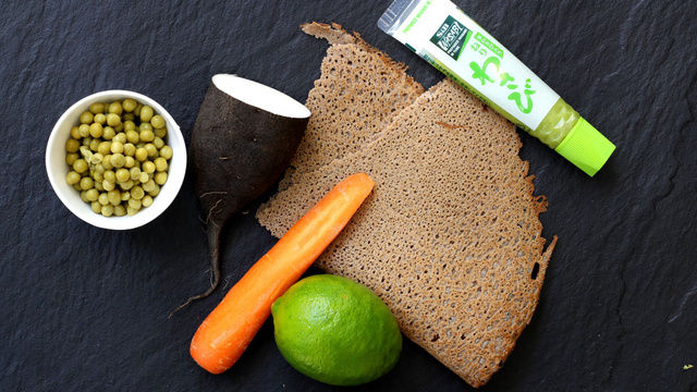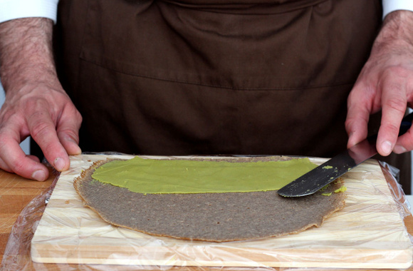 4Posez une galette sur du film étirable. Etalez le houmous de petits pois sur la moitié inférieure d'une galette de sarrasin. Ajoutez des pointes de wasabi.
