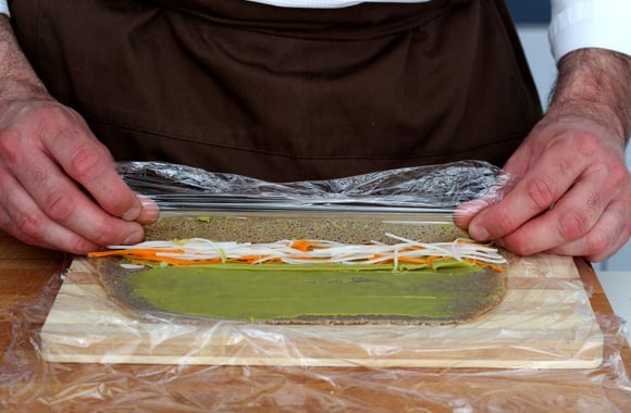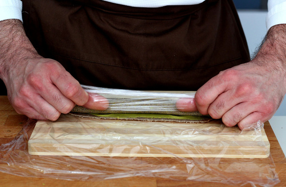 8Retirez une petite partie du dessus de la galette puis commencez à rouler en vous servant du film étirable.