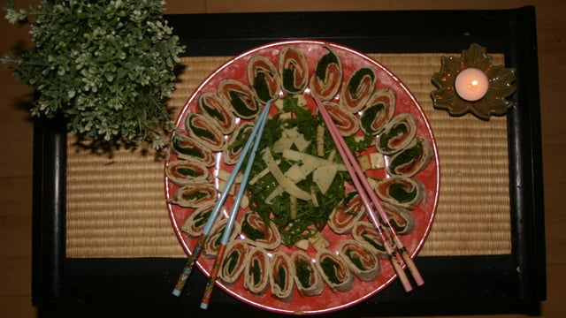 Découper les roulés en morceaux de 2cm environ puis les disposer dans un grand plat.