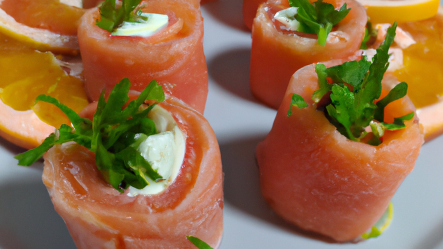 Disposez les tranches de saumon sur un film alimentaire. Assaisonnez-les sur les deux faces avec la marinade puis déposez la préparation à base de chèvre puis les tranches de pamplemousse dessus et roulez-les avec le film alimentaire.