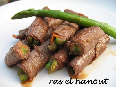 Découpez la carotte en fines lanières, puis recoupez ces lanières à la taille des tranches de boeuf. Mettez les asperges dans un bol résistant à la chaleur, recouvrez-les d'eau bouillante; laissez-les reposer 2 minutes.