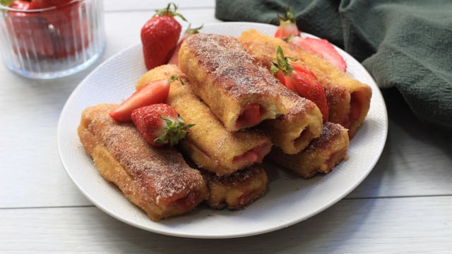 Retirez la croûte des tranches du pain brioché puis aplatissez-le avec un rouleau à pâtisserie. Placer environ 1 à 2 cuillères à café de confiture de fraise sur l'extrémité du pain. Roulez le pain de mie brioché afin d'obtenir un petit roulé bien serré. Répéter l'opération avec le reste des tranches.