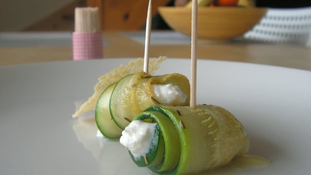 Un roulé de courgette contenant de la ricotta relevée de cumin. Idéal en amuse-bouche pour un apéritif ou pour une entrée.