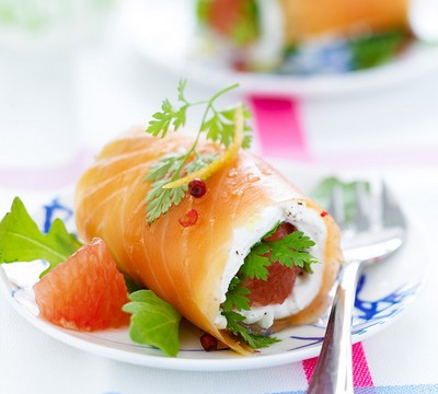 Dans un saladier, mélangez le chèvre, les zestes de pamplemousse, les ¾ des dés de pamplemousse, les ¾ des baies roses et la moitié de la coriandre ciselée. Préparez la marinade d'herbe en mélangeant l'huile d'olive, le reste de coriandre ciselée, la fleur de sel et le poivre.Disposez les tranches de saumon sur un film alimentaire. Assaisonnez-les sur les deux faces avec la marinade puis déposez la préparation à base de chèvre puis les tranches de pamplemousses dessus et roulez-les avec le film alimentaire.Réservez 2 heures au frais.Déroulez le rouleau de saumon et posez le sur un lit de jeunes pousses de roquette, agrémentez du reste des dés de pamplemousse. Arrosez de marinade d'herbe et saupoudrez de quelques baies roses avant de servir.