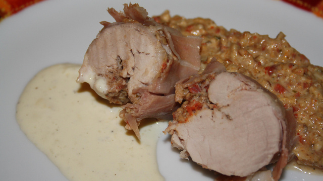 Couper les roulés en 4 morceaux, servir avec la sauce au chaource.