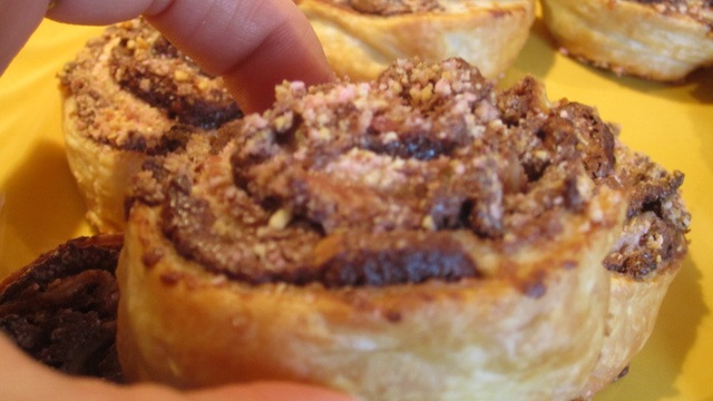 Dérouler la pâte feuilletée, étaler le nutella sur toute la surface en laissant un centimètre sur les bords de blanc. Saupoudrer le tout avec les éclats de pralines roses.