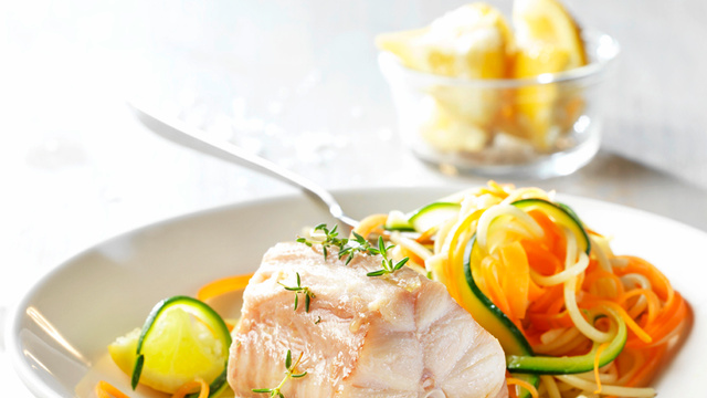 Dresser en assiette creuse : les légumes, le poisson et napper d'un peu de sauce.
