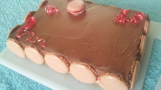 Démoulez le royal. Posez des coques de macarons tout autour du gâteau et un macaron fourré de confiture de fruits rouges sur le dessus. Et y déposez quelques pièces de sucre tiré pour donner de la couleur!