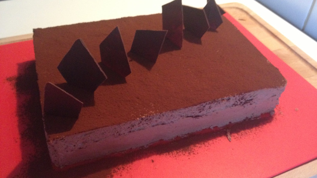 Sortir du réfrigérateur et couper le film alimentaire, retirer le cadre avec précaution. Si le bord du royal a quelques imperfections, vous pouvez lisser les bords mais attention car une fois prise au froid la mousse durcit