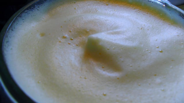 Battre au fouet pendant 10 à 15 minutes le temps que le mélange se transforme en mousse tiède et aérienne. La composition doit « faire le ruban », c'est que la composition est devenue épaisse. La composition reste attachée au fouet et elle doit retomber en s'affaissant tout doucement.