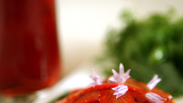 Pendant ce temps, émincez les fraises en fines lamelles, étalez-les dans un plat et arrosez-les d'huile d'olive, de vinaigre balsamique et de poivre de Sarawak râpé avec la râpe à noix de muscade.