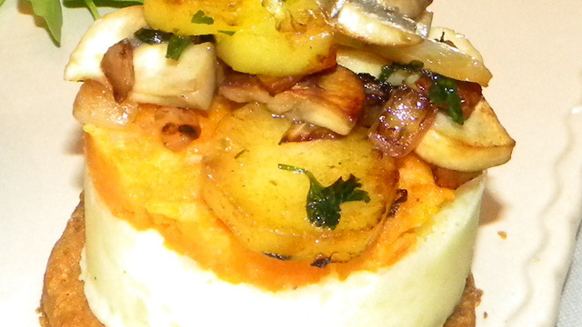 A l'aide du cercle, dresser la purée de pomme de terre sur le sablé (environ jusqu'à la moitié), puis une fine couche de purée de carotte et enfin, la poêlée de champignon. Servir chaud. Bon appétit !