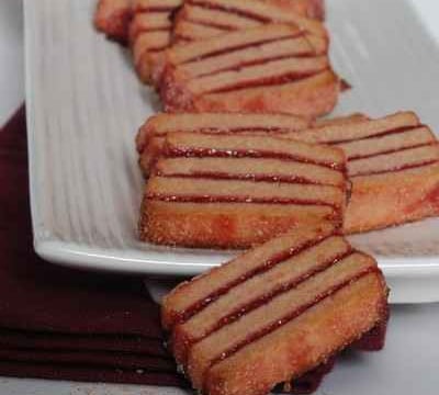 - La recette :Tamiser la farine avec la levure chimique. Faire une fontaine. Couper le beurre en petits morceaux et éparpiller sur la farine.Sabler ensemble farine, levure chimique, beurre, sucre glace, poudre d'amande et poudre de Biscuit Rose, jusqu'à obtention d'une texture rappelant celle du sable.Faire une fontaine avec ce mélange. Disposer le colorant* et les œufs au centre puis mélanger.* il est possible d'incorporer quelques gouttes de colorant alimentaire rouge afin de se rapprocher au maximum de la couleur du Biscuit Rose de Reims.Ecraser la pâte sous la paume de la main pour la rendre lisse et homogène, arrêter l'opération dès que la pâte ne colle plus au plan de travail.Faire une boule, aplatir légèrement, l'envelopper dans du film alimentaire. Laisser reposer au froid pendant une heure environ.Etaler la pâte à 4mm d'épaisseur puis détailler des bandes de 4cm. Tartiner la gelée de groseille sur 3 des bandes.Superposer les bandes puis, finir par la bande non tartinée. Réserver au congélateur puis détailler des tranches de 1 cm. Rouler dans la poudre rose.