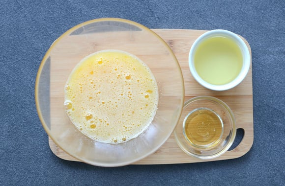 2Ajoutez le miel et l’huile de tournesol. Mélangez.