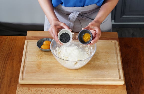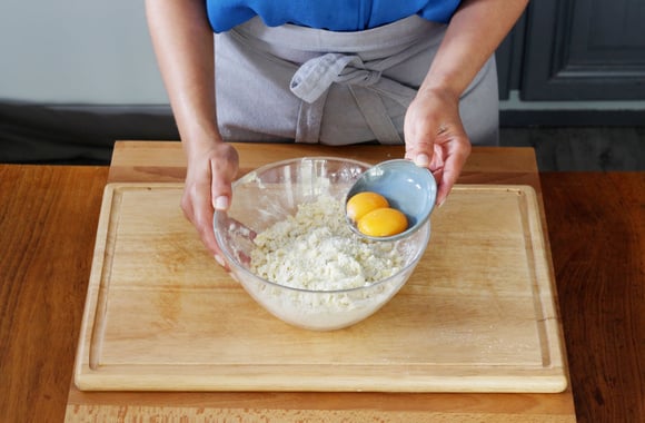 5Mélangez puis ajoutez les jaunes d’oeufs.