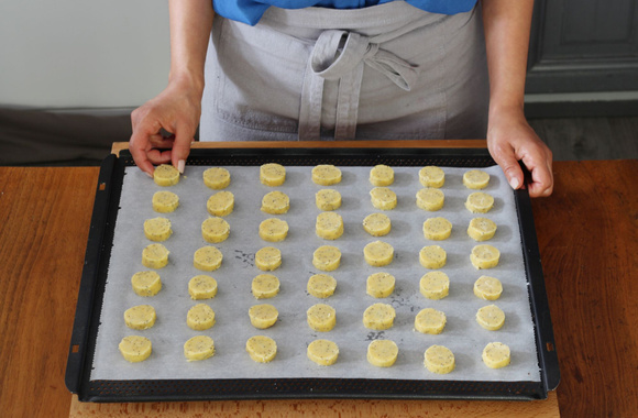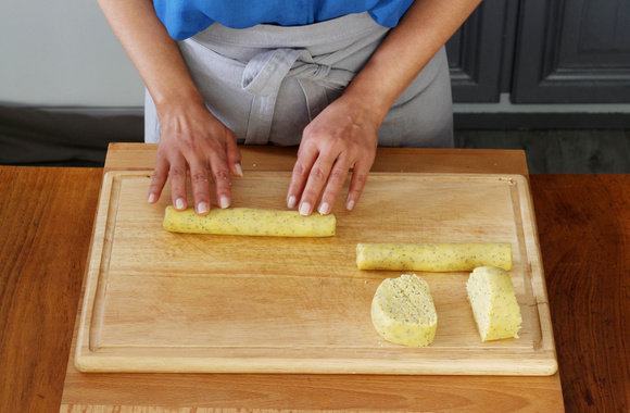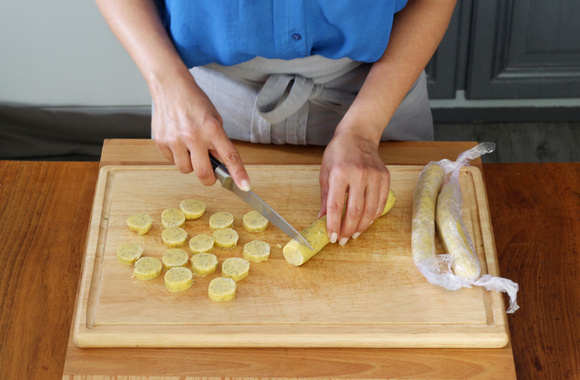 Retirez le film autour de la pâte et découpez chaque boudin en tranches d’environ 8 mm d’épaisseur.