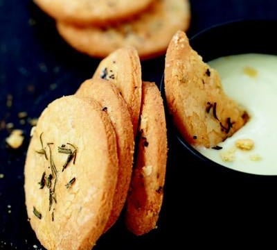 Disposer les sablés sur la plaque du four recouverte de papier sulfurisé. Espacer les sablés afin d'éviter qu'ils ne collent pendant la cuisson. Badigeonner la surface des sablés avec le blanc d'œuf et en décorer 1/3 avec le poivre 5 baies, 1/3 avec le romarin et 1/3 avec les graines de pavot. Enfourner et laisser cuire les sablés 12 minutes.