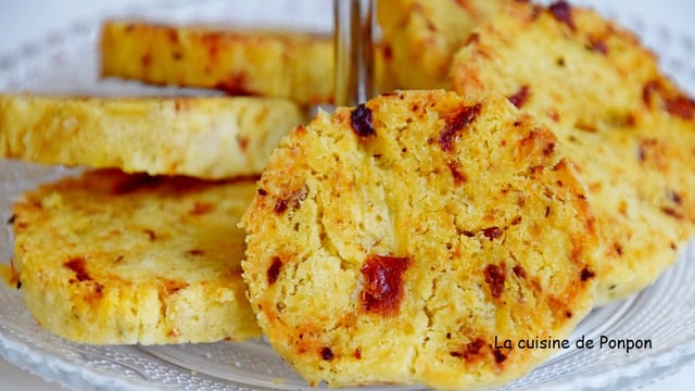 1Dans un saladier, mettre la farine, la fleur de sel le poivre et le beurre mou coupé en petits morceaux. Mélanger du bout des doigts pour obtenir un sable grossier. Couper les tomates séchées en très petits morceaux. Ajouter au mélange sablé : l’œuf, le pesto, les tomates et le fromage râpé. Mélanger pour former une boule de pâte. Faire un boudin et filmer. Réserver au frigo 1h ou au congélateur 30min.