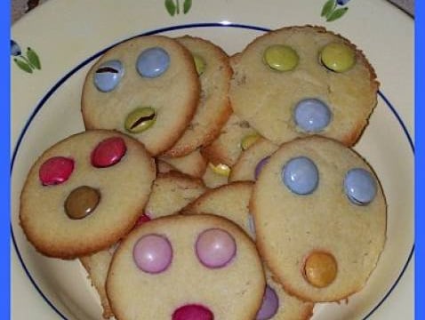Faire des petits biscuits à la main et enfoncer sur le dessus des biscuits des Smarties®.