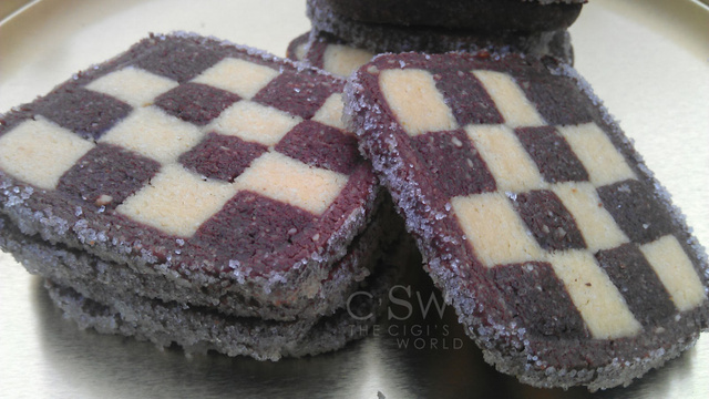Diviser les boules en plusieurs pâtons. Former des boudins et leur donner une forme rectangulaire. Bien prendre soin qu'il n'y ait pas de bulles d'air. Les lier à l'aide d'un mélange de blancs d'oeufs fouettés avec une c à s de lait et continuer la mise en forme. Avec un pâton restant, enrouler le "montage" de biscuits. Les réserver au frais pendant 1h. Étaler le sucre cristallisé uniformément sur une feuille de papier cuisson.