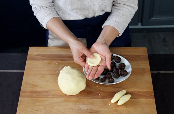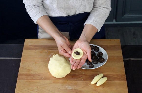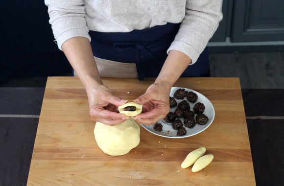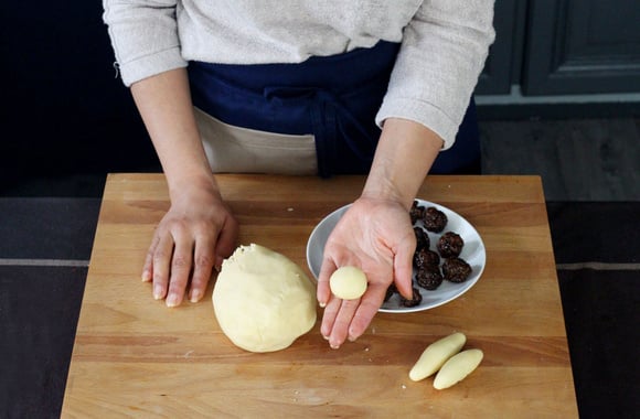 10Faites rouler la petite boule farcie sur la paume de la main pour obtenir un tout petit boudin. Faites de même avec le reste des ingrédients, afin d'obtenr tous les sablés.