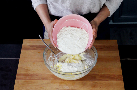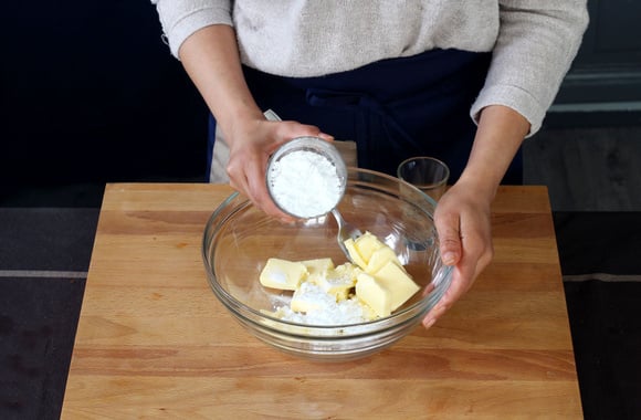 3Dans un saladier, travaillez le beurre mou, les 60 g de sucre glace et la levure chimique jusqu'à ce que le mélange soit crémeux.