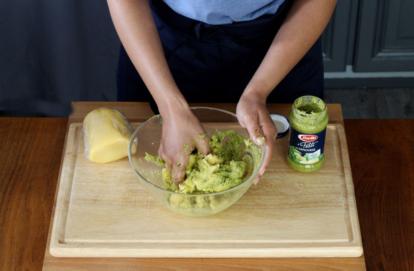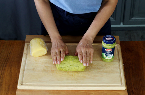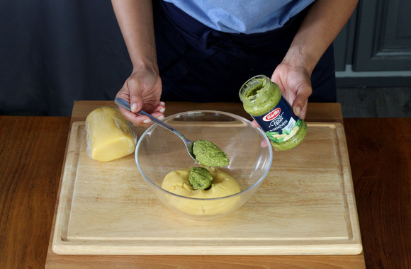 8Mettez le deuxième morceau dans un saladier avec 3 cuillères à soupe de pesto genovese et 2 cuillères à soupe de farine.