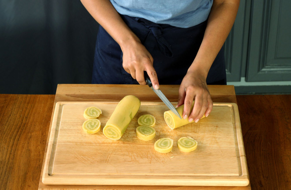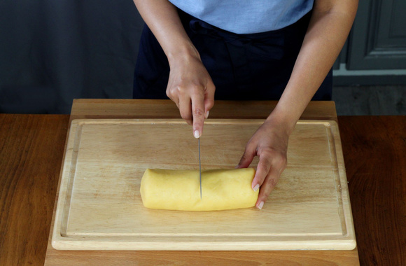 14Retirez le film alimentaire et coupez en tranche de 5 mm à l'aide d'un couteau bien tranchant afin de ne pas aplatir les sablés roulés.