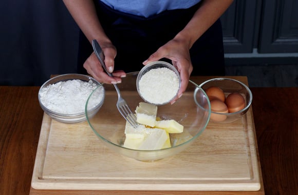 2Dans un saladier, mélangez le parmesan avec le beurre.