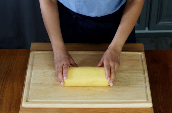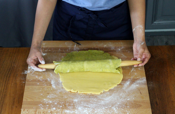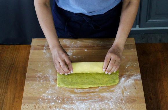 13Roulez les 2 pâtes en formant un boudin serré. Enveloppez-le de film alimentaire et réservez-le 30 min au frais.