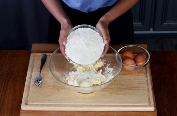 3Ajoutez la farine et les 2 pincées de sel.