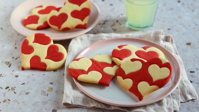 Etalez la pâte sablée rouge d’une épaisseur de 5 cm puis découpez des petits cœurs à l’aide d’un emporte pièce.