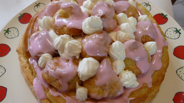 S'il vous reste du glaçage, essayez d'en décorer le bord du saint honoré. - 9VoilàVotre saint honoré est fini. Réservez au frais 4 heures et dégustez le !