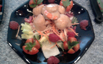 Disposer vos st Jacques sur votre salade, mettre des tomates cerises en fleur, du persil et des framboises en déco.
