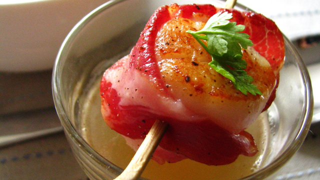 Saler et poivrer légèrement les noix de saint-Jacques. Enrouler une tranche de coppa sur chaque noix et piquer avec une cure-dent afin de maintenir l'ensemble.