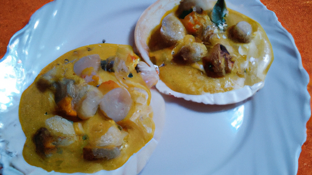 - Sauce blanche aromatisée au curry doux d'Assouan, fond de sauce de cuisson des champignons, fond de sauce au vin blanc, des Saint Jacques poêlées à l'ail.On mélange le tout