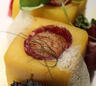 Réserver. Trancher très finement le saucisson des Aldudes, marquer les Saint-Jacques très rapidement dans un beurre mousseux puis les enrouler dans le saucisson et réserver.