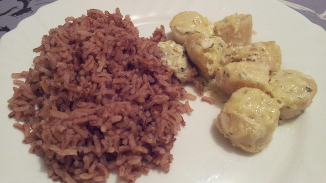 Ajouter l'aneth et remuer. Laisser réduire quelques instants. Porter une casserole d'eau à ébullition et y plonger le riz rose. Beurrer un moule à gratin, disposer les Saint Jacques cuites et les napper de la sauce à la crème. Saupoudrer un peu de parmesan pour gratiner le tout. Enfourner les Saint Jacques pendant 10 min et servir sur le riz rose thaïlandais.
