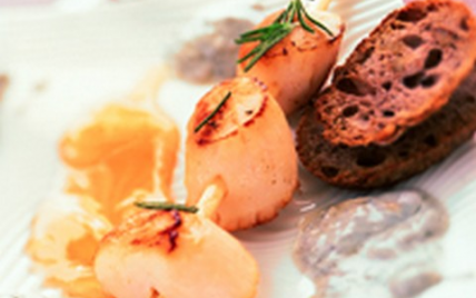 Dans une grande poêle plate, faites chauffer une noisette de beurre cru. Ajoutez les 4 brochettes dès que le beurre frémit et laissez-les dorer 40 secondes de chaque côté avec du romarin émietté. - 2