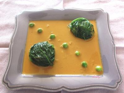 Réchauffez doucement la sauce. Déposez deux noix de Saint-Jacques dans les assiettes, versez la sauce, décorez de petits pois et servez.