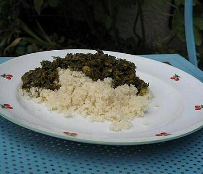 Quand le saka-saka au poisson est prêt, réchauffer la semoule 5 min. à la vapeur dans un couscoussier ou au cuit-vapeur, en égrenant la semoule avec une fourchette de temps en temps.