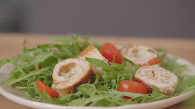 Découpez les paupiettes en rondelles et servez-les avec la roquette et tomates cerises assaisonnées.