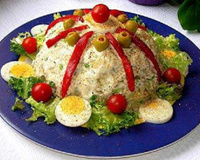 - 6Décorer avec un peu de laitue, quelques olives et les tomates cerises.Servir très frais.