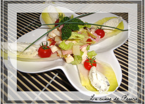 Pour la déco j'ai utilisé des feuilles d'endives, des tomates cerises, du persil, des brins de ciboulette et du philadelphia aux fines herbes.